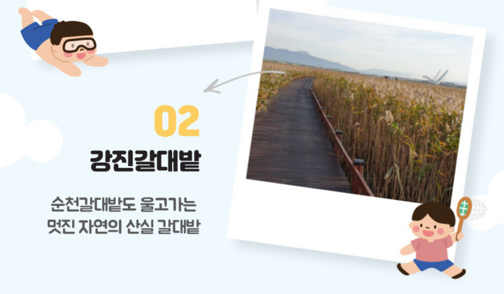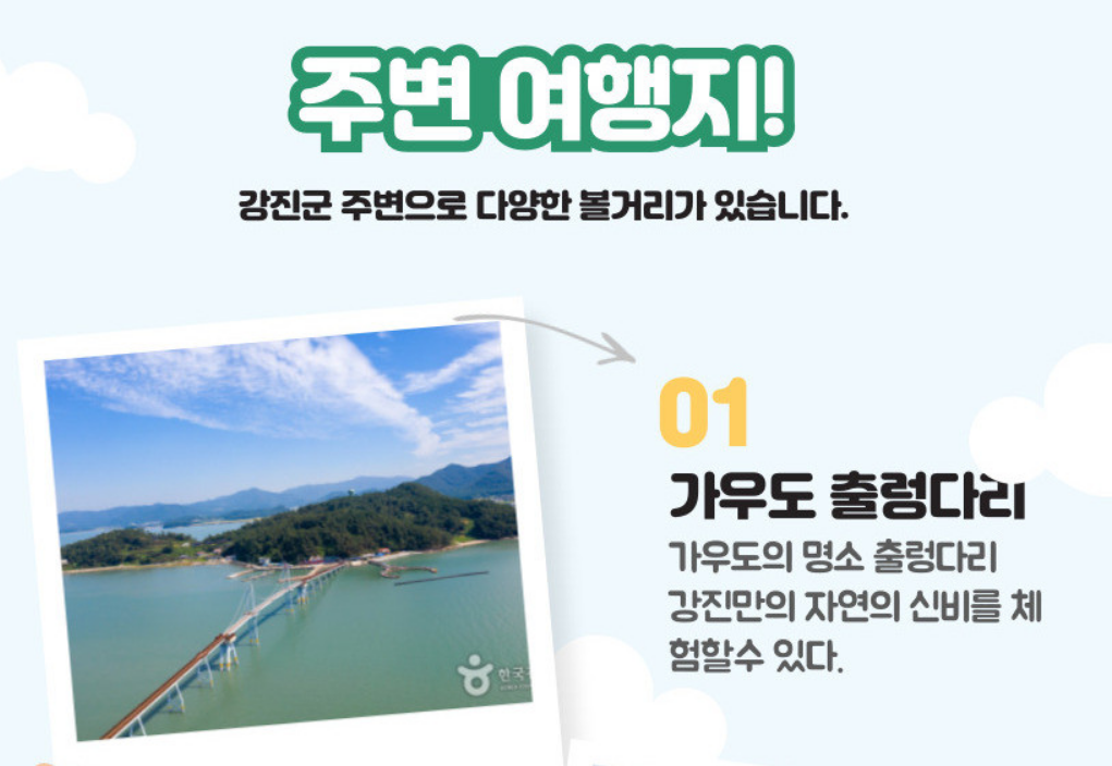 강진군 주변에 가우도 출렁다리, 강진갈대밭도 있고 월출산도 있어요.^^