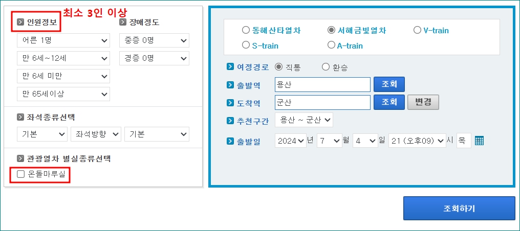 참고로 당일치기 여행으로 서해금빛열차 온돌방 이용하는 분들이 많은데요. 그중에서 특히나 용산에서 익산이나 군산으로 내려가는 온돌실은 거의 매진이라고 보시면 됩니다. 여기 예약하시려면 경쟁하셔야해요.