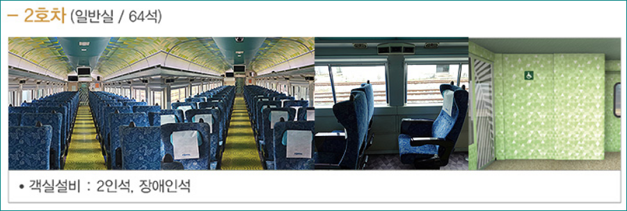 2호차도 일반실입니다. 1호차와 같아요. 전체 분위기 색상이 1호차와는 다르게 연두연두한 느낌이군요.