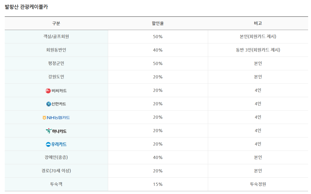발왕산 관광케이블카 할인 적용은 다음 표를 참고해주세요.