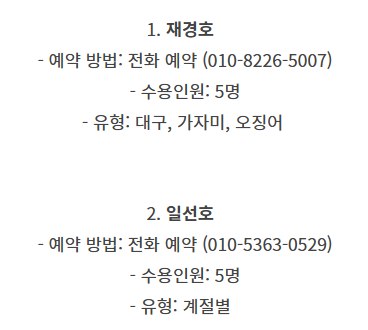 낚시를 즐기실 생각이시라면, 사전에 타실 어선을 확인 후 전화예약을 하신 후에 할 수 있습니다.
