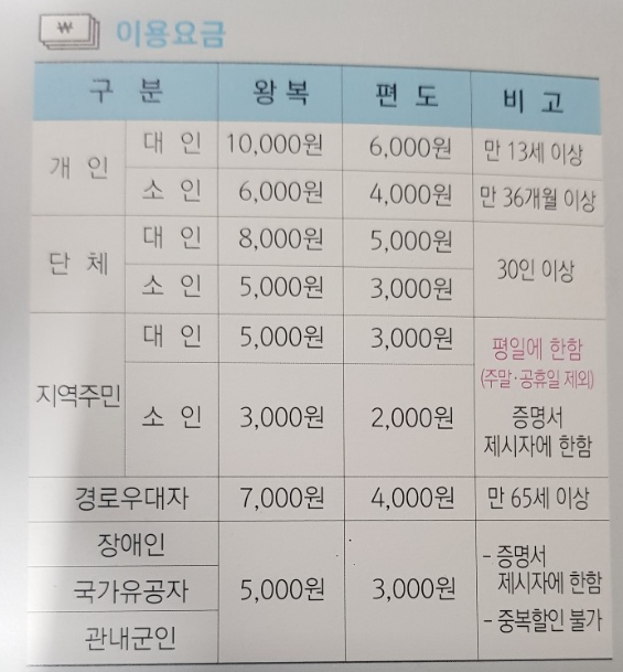 단체나 지역주민인 경우 추가 할인이 있으니 위에 표 참고하시길 바래요.