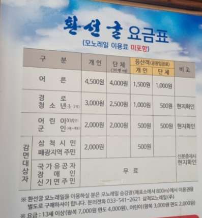 아래 사진 보시면 환선굴 소요시간이 약 2시간이라고 되어 있는데, 환선굴 관람시간이 2시간이 아니라 환선굴까지 가는 길이 30분이고, 환선굴 내부 관람은 1시간정도 소요돼요.