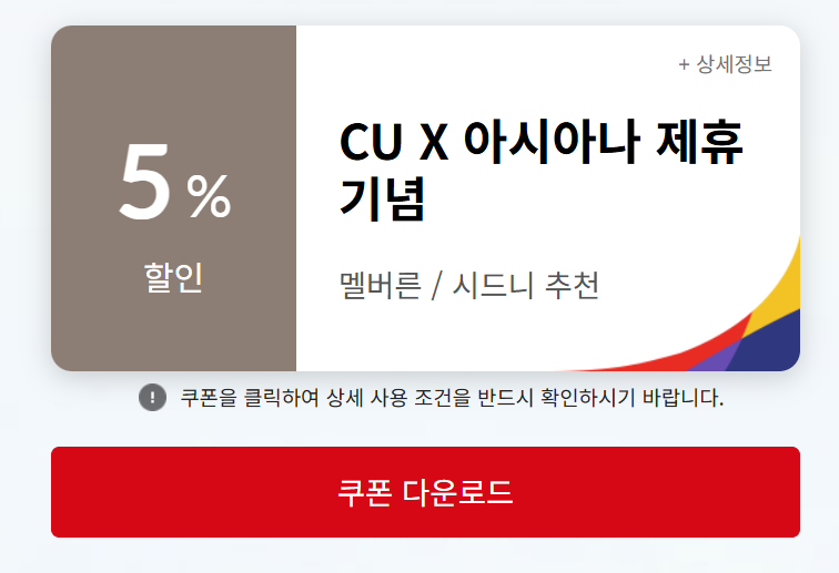 근데 노션별로 기간이 조금씩 다르니깐 확인해주세요. - 할인 노선: 인천발 멜버른, 시드니, 홍콩, 후쿠오카행 왕복 상품