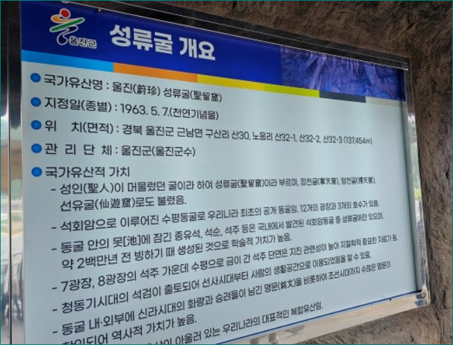 가다보면 만나는 성류굴의 개요. 이거 다 줄줄이 읽는 사람이 얼마나 되겠냐마는 아 ~ 천연기념물이구나~ 기대된다~하고 지나가면 될듯?