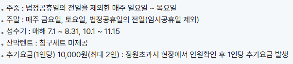 - 전기료: 4,000원 - 취사도구 세트 1박: 10,000원 - 추가요금: 1인당 10,000원 추가(최대 2명까지만). 캠핑장 정원 맞는지 수시로 확인함 - 산막텐트: 침구세트는 제공 안함. 가지고 오세요 - 성수기 시즌: 매년 07.01 ~ 08.31 / 10.1 ~ 11.15 까지 |