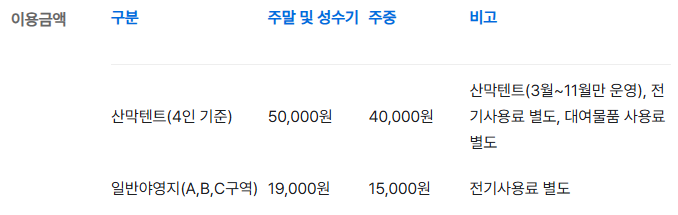 일반 야영지(A,B,C) | 19,000원 | 15,000원 | 주중: 법정 공휴일 제외한 매주 일 ~ 목요일까지 주말: 매주 금, 토요일, 법정 공휴일의 전일만.(임시 공휴일 제외) |