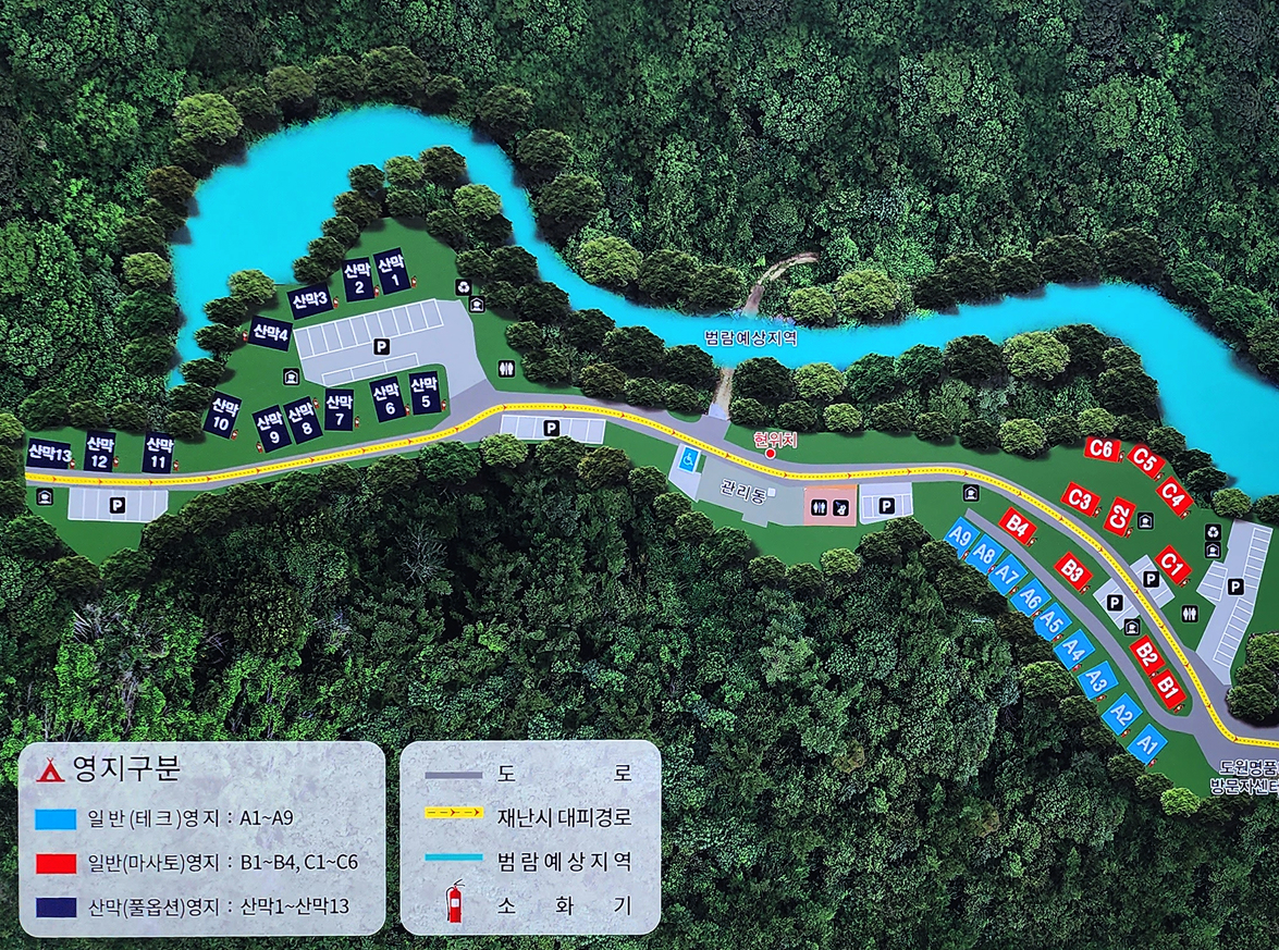 설명: 야영장과 가까운 도원계곡은 맑은 물과 아름다운 경치로 유명해요. 가족과 함께 물놀이를 하거나, 간단한 바비큐를 즐기기에도 좋은 장소랍니다. 여름철에는 특히 많은 사람들이 찾는 곳이에요.