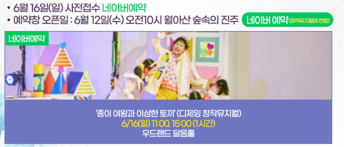 어린이들이 참여하기 좋은 종이 여왕과 이상한 토끼 뮤지컬도 관람하실 수 있습니다.