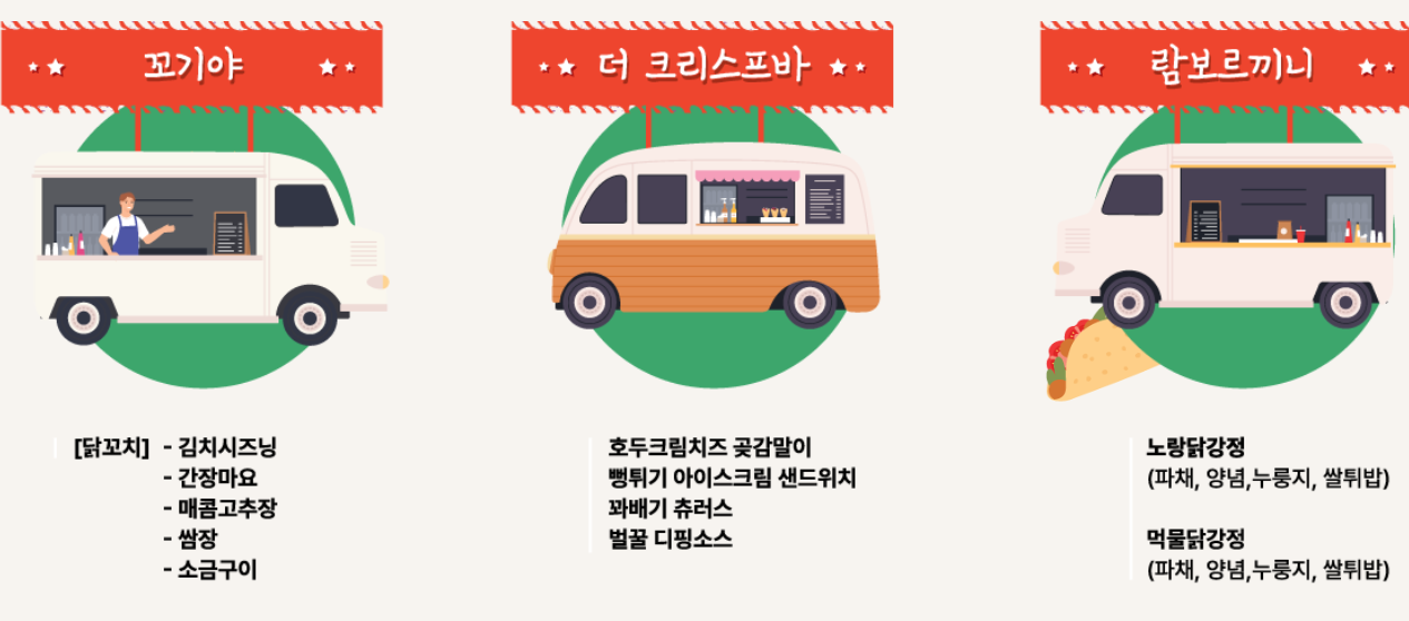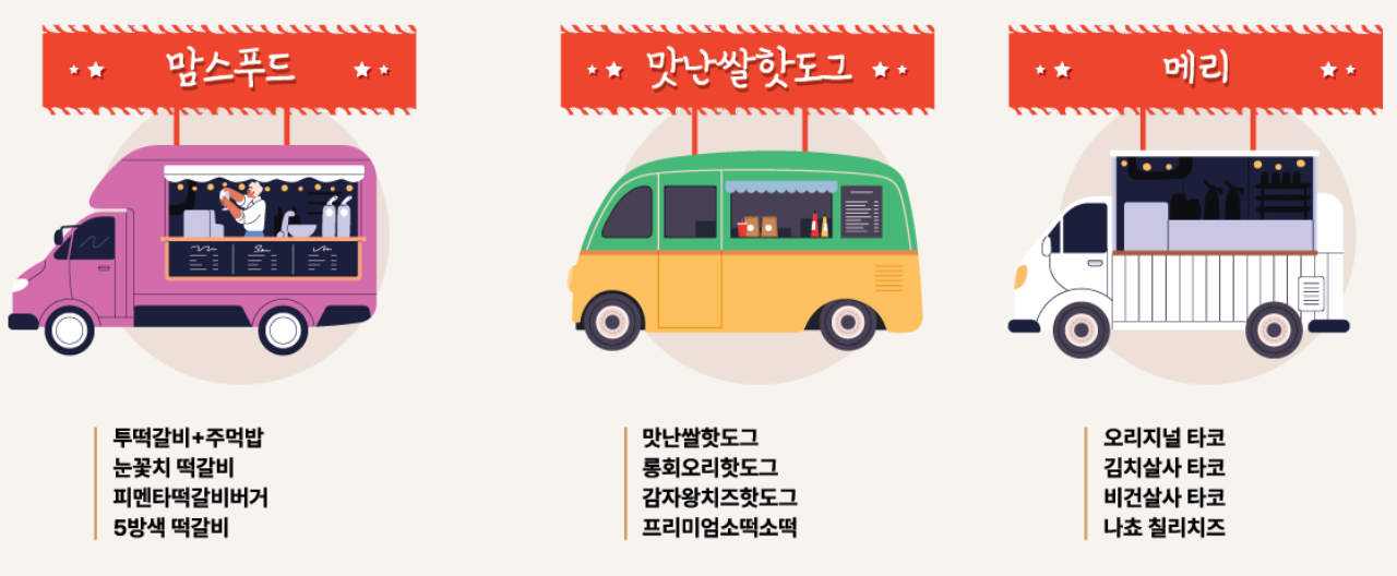 오, 많은 푸드트럭들이 줄지어 있네요.